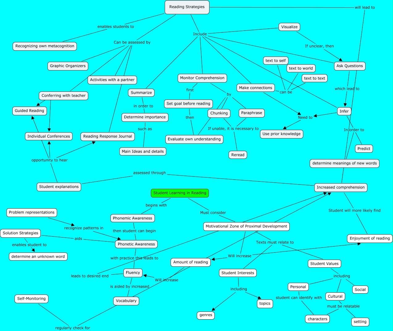 This Concept Map, created with IHMC CmapTools, has information related to: Integrated Concept Map, Reading Strategies Include Infer, Fluency leads to desired end Increased comprehension, Reread If unable, it is necessary to Paraphrase, Student Values including Personal, Student explanations opportunity to hear Guided Reading, Determine importance such as Main Ideas and details, Student explanations opportunity to hear Reading Response Journal, Phonemic Awareness then student can begin Phonetic Awareness, Reading Strategies Include Monitor Comprehension, Reading Strategies Include Summarize, Make connections can be text to world, Student Values including Social, Motivational Zone of Proximal Development Texts must relate to Student Interests, Reading Strategies enables students to Recognizing own metacognition, Reading Strategies Can be assessed by Reading Response Journal, Infer In order to Predict, Phonetic Awareness with practice this leads to Fluency, Reread If unable, it is necessary to Chunking, Motivational Zone of Proximal Development Will increase Amount of reading, Visualize If unclear, then Ask Questions