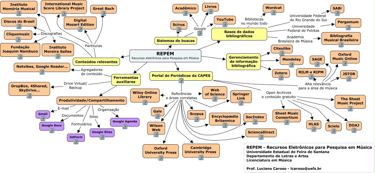 Esse mapa conceitual, produzido no IHMC CmapTools, tem a informação relacionada a: REPEM, Conteúdos relevantes Partituras International Music Score Library Project, Conteúdos relevantes Discografias Fundação Joaquim Nambuco, Portal de Periódicos da CAPES Open Archives e conteúdo gratuito DOAJ, Portal de Periódicos da CAPES Alta relevância para a área de música SAGE, Sistemas de buscas ???? Scirus, Portal de Periódicos da CAPES Referências e áreas correlatas Wiley Online Library, Portal de Periódicos da CAPES Referências e áreas correlatas Wilson Web, Portal de Periódicos da CAPES Open Archives e conteúdo gratuito The Sheet Music Project, Conteúdos relevantes Partituras Digital Mozart Edition, Portal de Periódicos da CAPES Referências e áreas correlatas Encyclopædia Britannica, Portal de Periódicos da CAPES Referências e áreas correlatas ScienceDirect, Bases de dados bibliográficos Universidade Federal de Pelotas Pergamum, Portal de Periódicos da CAPES Alta relevância para a área de música Oxford Music Online, Produtividade/Compartilhamento E-mail Gmail, REPEM Recursos eletrônicos para Pesquisa em Música ???? Gerenciamento de informação bibliográfica, Portal de Periódicos da CAPES Open Archives e conteúdo gratuito Sheet Music Consortium, Sistemas de buscas Google Acadêmico, Portal de Periódicos da CAPES Referências e áreas correlatas Gale, Portal de Periódicos da CAPES Open Archives e conteúdo gratuito Scielo, Produtividade/Compartilhamento Documentos Google Docs
