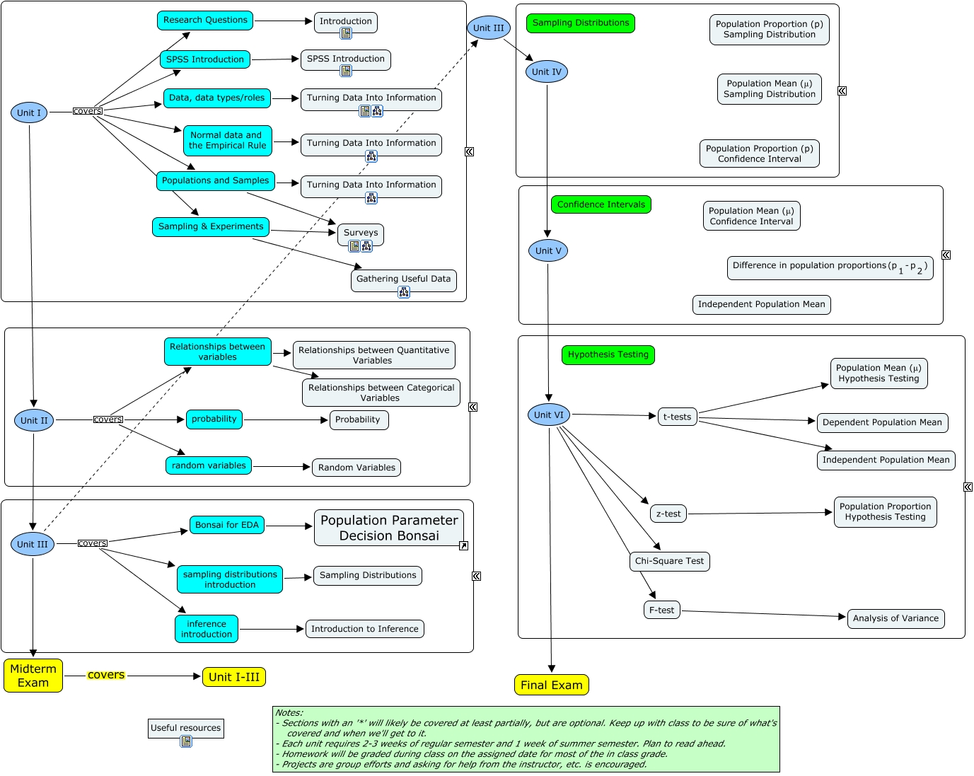 This Concept Map, created with IHMC CmapTools, has information related to: AF-Syllabus, z-test Population Proportion Hypothesis Testing, Data, data types/roles Turning Data Into Information, Unit VI Final Exam, t-tests Independent Population Mean, Unit I covers Sampling & Experiments, Unit II covers Relationships between variables, sampling distributions introduction Sampling Distributions, SPSS Introduction SPSS Introduction, Unit I covers Populations and Samples, Unit VI Chi-Square Test, Unit I covers Normal data and the Empirical Rule, Populations and Samples Turning Data Into Information, Unit I covers Data, data types/roles, Unit III Unit III, Unit VI F-test, Unit III covers inference introduction, Research Questions Introduction, Normal data and the Empirical Rule Turning Data Into Information, Unit I Unit II, Unit VI t-tests