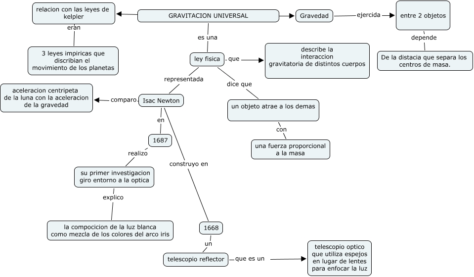 Este Cmap, tiene información relacionada con: Sin Título 1, 1687 realizo su primer investigacion giro entorno a la optica, entre 2 objetos depende De la distacia que separa los centros de masa., ley fisica representada Isac Newton, Isac Newton comparo aceleracion centripeta de la luna con la aceleracion de la gravedad, un objeto atrae a los demas con una fuerza proporcional a la masa, ley fisica dice que un objeto atrae a los demas, su primer investigacion giro entorno a la optica explico la compocicion de la luz blanca como mezcla de los colores del arco iris, Gravedad ejercida entre 2 objetos, Isac Newton construyo en 1668, GRAVITACION UNIVERSAL ???? relacion con las leyes de kelpler, relacion con las leyes de kelpler eran 3 leyes impiricas que discribian el movimiento de los planetas, Isac Newton en 1687, ley fisica que describe la interaccion gravitatoria de distintos cuerpos, GRAVITACION UNIVERSAL es una ley fisica, 1668 un telescopio reflector, telescopio reflector que es un telescopio optico que utiliza espejos en lugar de lentes para enfocar la luz, GRAVITACION UNIVERSAL ???? Gravedad
