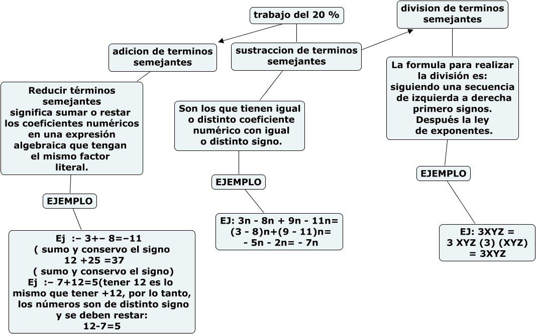 Este Cmap, tiene información relacionada con: DOCUEMNTOS DE DESCARGAS, EJEMPLO ???? EJ: 3XYZ = 3 XYZ (3) (XYZ) = 3XYZ, sustraccion de terminos semejantes ???? Son los que tienen igual o distinto coeficiente numérico con igual o distinto signo., adicion de terminos semejantes ???? Reducir términos semejantes significa sumar o restar los coeficientes numéricos en una expresión algebraica que tengan el mismo factor literal., Reducir términos semejantes significa sumar o restar los coeficientes numéricos en una expresión algebraica que tengan el mismo factor literal. ???? EJEMPLO, La formula para realizar la división es: siguiendo una secuencia de izquierda a derecha primero signos. Después la ley de exponentes. ???? EJEMPLO, EJEMPLO ???? EJ: 3n - 8n + 9n - 11n= (3 - 8)n+(9 - 11)n= - 5n - 2n= - 7n, Son los que tienen igual o distinto coeficiente numérico con igual o distinto signo. ???? EJEMPLO, sustraccion de terminos semejantes ???? division de terminos semejantes, trabajo del 20 % adicion de terminos semejantes, division de terminos semejantes ???? La formula para realizar la división es: siguiendo una secuencia de izquierda a derecha primero signos. Después la ley de exponentes., trabajo del 20 % ???? sustraccion de terminos semejantes, EJEMPLO ???? Ej :– 3+– 8=–11 ( sumo y conservo el signo 12 +25 =37 ( sumo y conservo el signo) Ej :– 7+12=5(tener 12 es lo mismo que tener +12, por lo tanto, los números son de distinto signo y se deben restar: 12-7=5