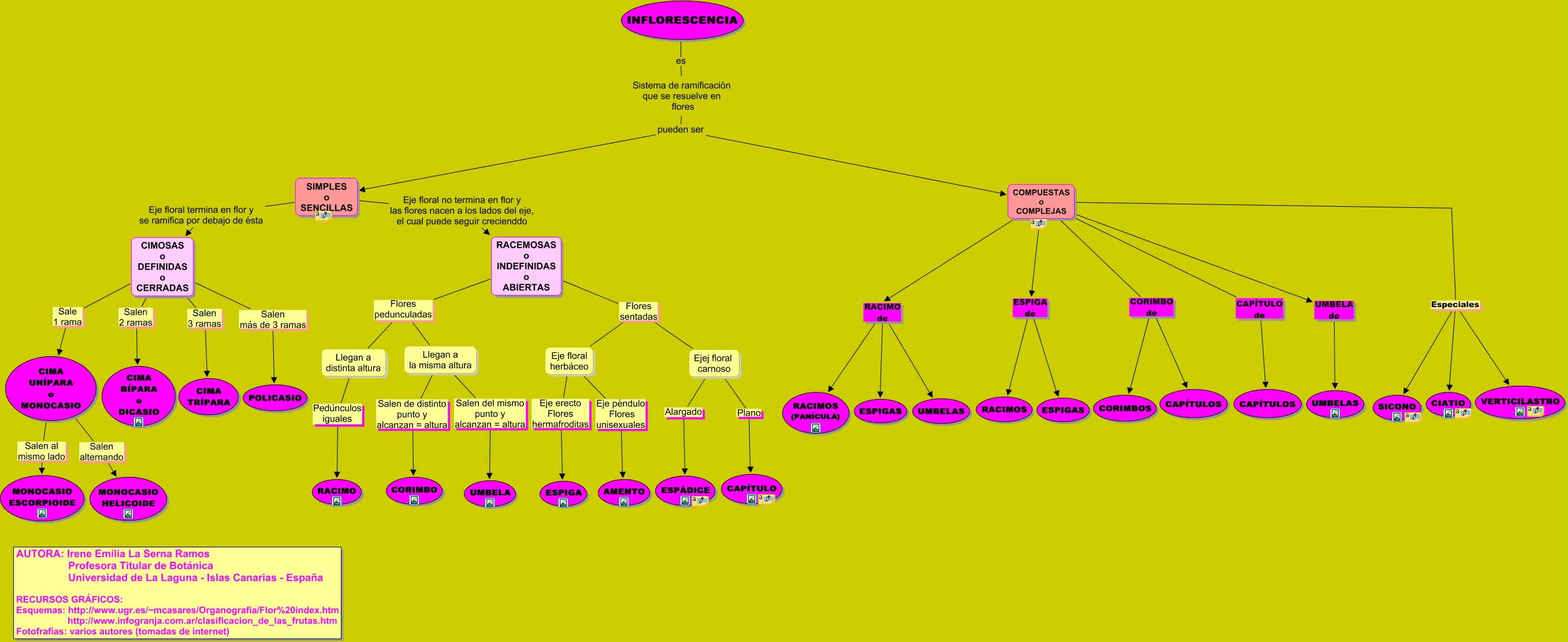 Este Cmap, tiene información relacionada con: INFLORESCENCIAS, CIMOSAS o DEFINIDAS o CERRADAS Salen 3 ramas CIMA TRÍPARA, Llegan a la misma altura Salen de distinto punto y alcanzan = altura CORIMBO, COMPUESTAS o COMPLEJAS CORIMBO de CORIMBOS, COMPUESTAS o COMPLEJAS CORIMBO de CAPÍTULOS, CIMOSAS o DEFINIDAS o CERRADAS Salen 2 ramas CIMA BÍPARA o DICASIO, COMPUESTAS o COMPLEJAS RACIMO de ESPIGAS, Eje floral herbáceo Eje péndulo Flores unisexuales AMENTO, CIMA UNÍPARA o MONOCASIO Salen al mismo lado MONOCASIO ESCORPIOIDE, COMPUESTAS o COMPLEJAS ESPIGA de RACIMOS, COMPUESTAS o COMPLEJAS UMBELA de UMBELAS, Ejej floral carnoso Plano CAPÍTULO, CIMOSAS o DEFINIDAS o CERRADAS Sale 1 rama CIMA UNÍPARA o MONOCASIO, COMPUESTAS o COMPLEJAS Especiales SICONO, CIMA UNÍPARA o MONOCASIO Salen alternando MONOCASIO HELICOIDE, Sistema de ramificación que se resuelve en flores pueden ser COMPUESTAS o COMPLEJAS, COMPUESTAS o COMPLEJAS Especiales VERTICILASTRO, SIMPLES o SENCILLAS Eje floral no termina en flor y las flores nacen a los lados del eje, el cual puede seguir crecienddo RACEMOSAS o INDEFINIDAS o ABIERTAS, COMPUESTAS o COMPLEJAS ESPIGA de ESPIGAS, CIMOSAS o DEFINIDAS o CERRADAS Salen más de 3 ramas POLICASIO, Llegan a distinta altura Pedúnculos iguales RACIMO