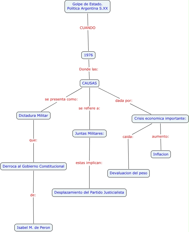 Este Cmap, tiene información relacionada con: Golpe de Estado, Derroca al Gobierno Constitucional de: Isabel M. de Peron, CAUSAS dada por: Crisis economica importante:, Juntas Militares: estas implican: Desplazamiento del Partido Justicialista, CAUSAS se refiere a: Juntas Militares:, CAUSAS se presenta como: Dictadura Militar, Crisis economica importante: caida: Devaluacion del peso, Crisis economica importante: aumento: Inflacion, Dictadura Militar que: Derroca al Gobierno Constitucional, Golpe de Estado. Politica Argentina S.XX CUANDO 1976, 1976 Donde las: CAUSAS