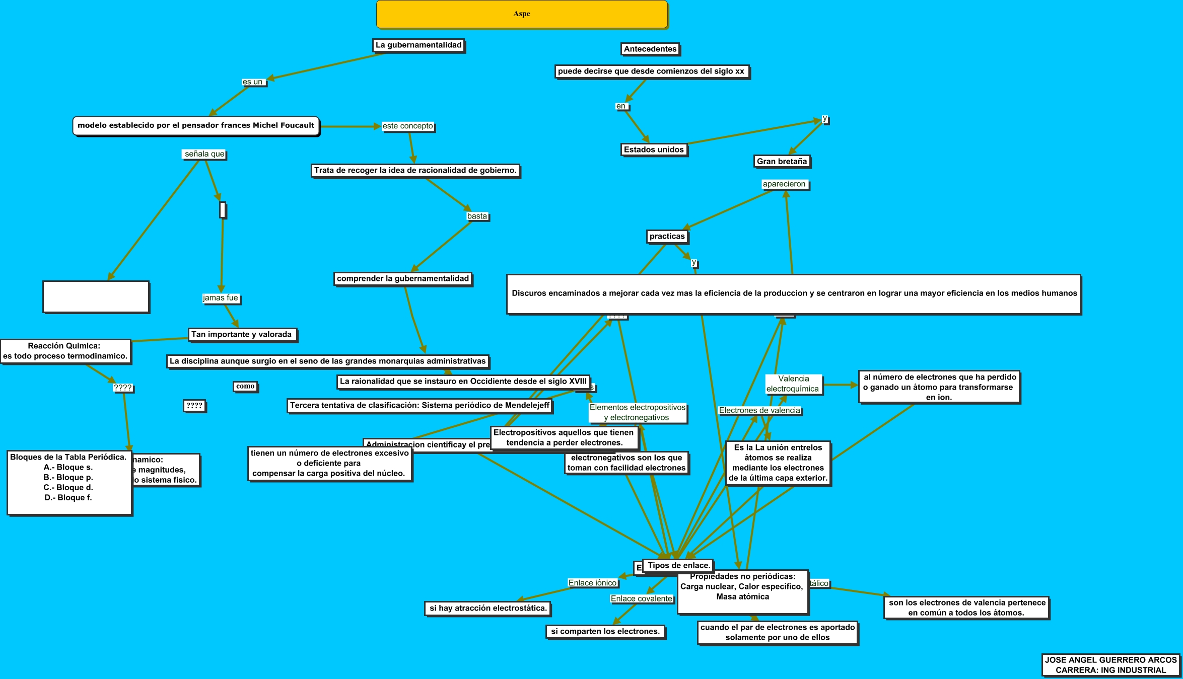 Este Cmap, tiene información relacionada con: andres sanabria, Tipos de enlace. Enlace metálico son los electrones de valencia pertenece en común a todos los átomos., Es la La unión entrelos átomos se realiza mediante los electrones de la última capa exterior. ???? Tipos de enlace., Enlaces químicos Valencia electroquímica al número de electrones que ha perdido o ganado un átomo para transformarse en ion., Enlaces químicos Elementos electropositivos y electronegativos Electropositivos aquellos que tienen tendencia a perder electrones., Enlaces químicos Iones tienen un número de electrones excesivo o deficiente para compensar la carga positiva del núcleo., comprender la gubernamentalidad como La raionalidad que se instauro en Occidiente desde el siglo XVIII, Trata de recoger la idea de racionalidad de gobierno. basta comprender la gubernamentalidad, Tipos de enlace. Enlace covalente si comparten los electrones., Electropositivos aquellos que tienen tendencia a perder electrones. ???? Tipos de enlace., Propiedades no periódicas: Carga nuclear, Calor específico, Masa atómica ???? Enlaces químicos, modelo establecido por el pensador frances Michel Foucault este concepto Trata de recoger la idea de racionalidad de gobierno., Estados unidos y Gran bretaña, Tipos de enlace. Enlace covalente coordinado cuando el par de electrones es aportado solamente por uno de ellos, al número de electrones que ha perdido o ganado un átomo para transformarse en ion. ???? Tipos de enlace., Enlaces químicos Electrones de valencia Es la La unión entrelos átomos se realiza mediante los electrones de la última capa exterior., Administracion cientificay el presupuesto y los costos estandar ???? Enlaces químicos, Reacción Quimica: es todo proceso termodinamico. ???? Termodinamico: la evolución de magnitudes, de un determinado sistema fisico., Tan importante y valorada ???? Reacción Quimica: es todo proceso termodinamico., La gubernamentalidad es un modelo establecido por el pensador frances Michel Foucault, Tipos de enlace. Enlace iónico si hay atracción electrostática.