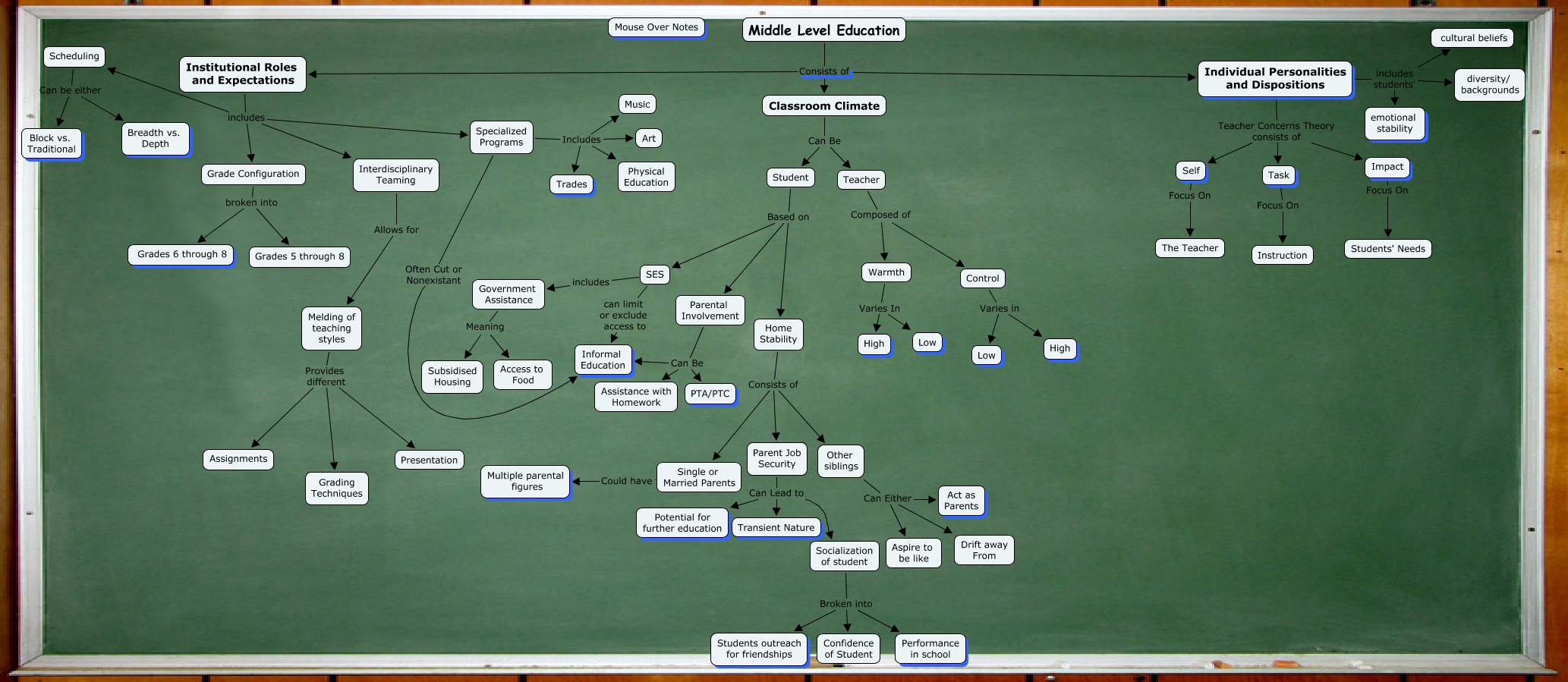 This Concept Map, created with IHMC CmapTools, has information related to: Riley Kellen Chris, Self Focus On The Teacher, Melding of teaching styles Provides different Presentation, SES includes Government Assistance, Teacher Composed of Control, Control Varies in Low, Other siblings Can Either Act as Parents, Institutional Roles and Expectations includes Specialized Programs, Individual Personalities and Dispositions Teacher Concerns Theory consists of Impact, Institutional Roles and Expectations includes Scheduling, Impact Focus On Students' Needs, Government Assistance Meaning Subsidised Housing, Home Stability Consists of Parent Job Security, Individual Personalities and Dispositions includes students' diversity/ backgrounds, Other siblings Can Either Aspire to be like, Scheduling Can be either Block vs. Traditional, Individual Personalities and Dispositions includes students' cultural beliefs, Melding of teaching styles Provides different Grading Techniques, Parental Involvement Can Be Informal Education, Parental Involvement Can Be Assistance with Homework, Melding of teaching styles Provides different Assignments
