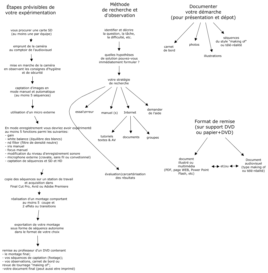 Cette carte de concepts créée avec IHMC CmapTools traite de: consignes lâché-lousse 1, utilisation d'un micro externe En mode enregistrement vous devriez avoir expérimenté au moins 5 fonctions parmi les suivantes: - gain - white balance (équilibre des blancs) - nd filter (filtre de densité neutre) - iris manuel - focus manuel - modification du niveau d'enregistrement sonore - microphone externe (cravate, sans fil ou convetionnel) - captation de séquences et SD et HD, Internet groupes, Documenter votre démarche (pour présentation et dépot) carnet de bord, Documenter votre démarche (pour présentation et dépot) illustrations, emprunt de la caméra au comptoir de l'audiovisuel mise en marche de la caméra en observant les consignes d'hygiène et de sécurité, document illustré ou multimédia (PDF, page WEB, Power Point Flash, etc) et|ou Document audiovisuel (type making of ou télé-réalité), quelles hypothèses de solution pouvez-vous immédiatement formuler ? votre stratégie de recherche, vous procurer une carte SD (au moins une par équipe) emprunt de la caméra au comptoir de l'audiovisuel, Documenter votre démarche (pour présentation et dépot) photos, Internet documents, En mode enregistrement vous devriez avoir expérimenté au moins 5 fonctions parmi les suivantes: - gain - white balance (équilibre des blancs) - nd filter (filtre de densité neutre) - iris manuel - focus manuel - modification du niveau d'enregistrement sonore - microphone externe (cravate, sans fil ou convetionnel) - captation de séquences et SD et HD copie des séquences sur un station de travail et acquisition dans Final Cut Pro, Avid ou Adobe Premiere, votre stratégie de recherche demander de l'aide, identifier et décrire la question, la tâche, la difficulté, etc. quelles hypothèses de solution pouvez-vous immédiatement formuler ?, votre stratégie de recherche manuel (s), réalisation d'un montage comportant au moins 5 coupe et 2 effets ou transitions exportation de votre montage sous forme de séquence autonome dans le format de votre choix, votre stratégie de recherche Internet, Format de remise (sur support DVD ou papier+DVD) Document audiovisuel (type making of ou télé-réalité), Format de remise (sur support DVD ou papier+DVD) Document audiovisuel (type making of ou télé-réalité), mise en marche de la caméra en observant les consignes d'hygiène et de sécurité captation d'images en mode manuel et automatique (au moins 5 séquences), votre stratégie de recherche évaluation|carcartérisation des résultats