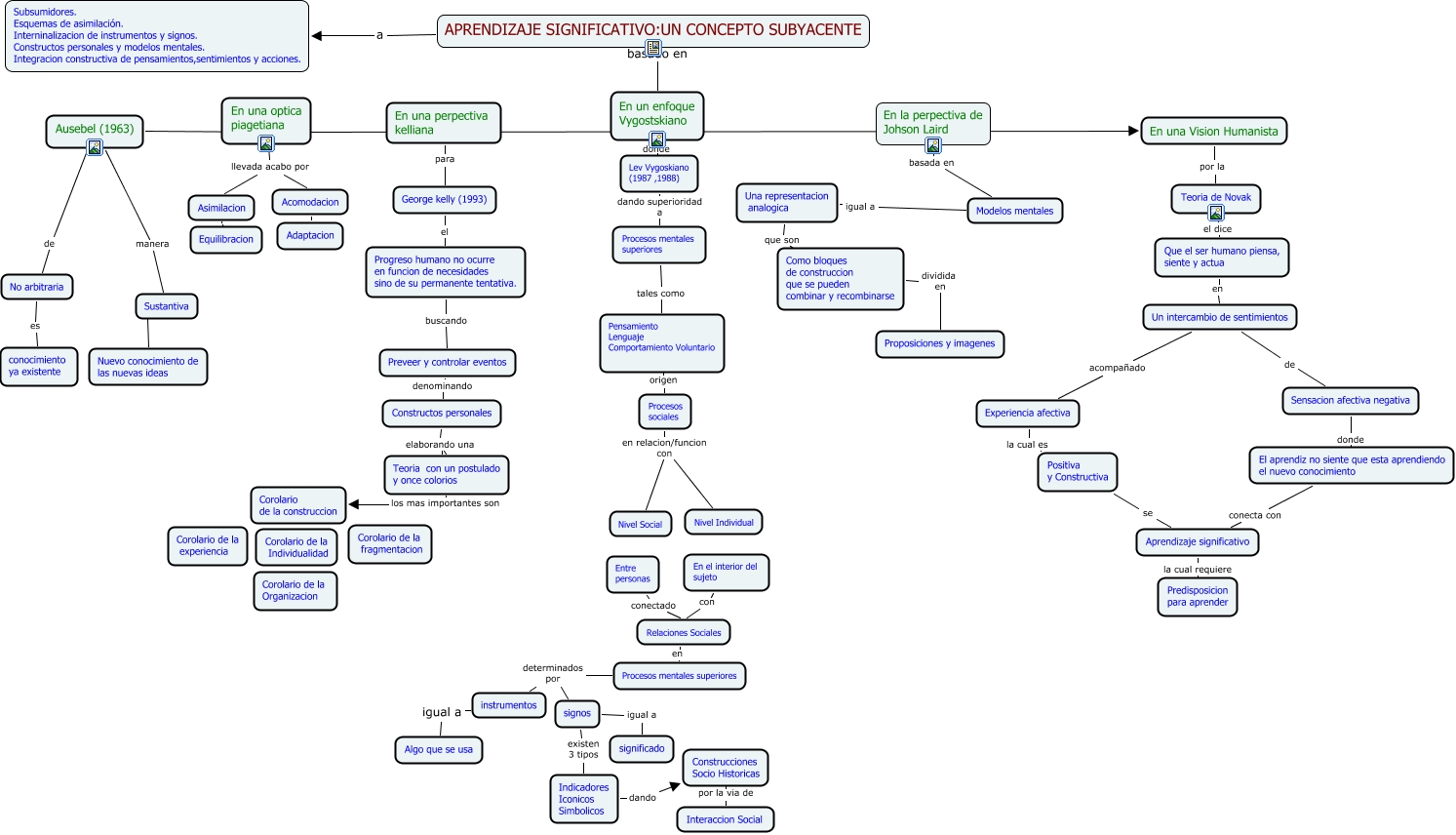 Este Cmap, tiene información relacionada con: aprendizaje significativo, Modelos mentales igual a Una representacion analogica, Equilibracion Asimilacion, Constructos personales elaborando una Teoria con un postulado y once colorios, Pensamiento Lenguaje Comportamiento Voluntario origen Procesos sociales, Procesos mentales superiores determinados por signos, Una representacion analogica que son Como bloques de construccion que se pueden combinar y recombinarse, signos existen 3 tipos Indicadores Iconicos Simbolicos, APRENDIZAJE SIGNIFICATIVO:UN CONCEPTO SUBYACENTE basado en En un enfoque Vygostskiano, Constructos personales elaborando una Teoria con un postulado y once colorios, En la perpectiva de Johson Laird basada en Modelos mentales, En un enfoque Vygostskiano donde Lev Vygoskiano (1987 ,1988), En una optica piagetiana llevada acabo por Asimilacion, Un intercambio de sentimientos de Sensacion afectiva negativa, Ausebel (1963) por En una Vision Humanista, En una optica piagetiana llevada acabo por Acomodacion, Ausebel (1963) de No arbitraria, No arbitraria es conocimiento ya existente, Un intercambio de sentimientos acompañado Experiencia afectiva, Sustantiva Nuevo conocimiento de las nuevas ideas, George kelly (1993) el Progreso humano no ocurre en funcion de necesidades sino de su permanente tentativa.