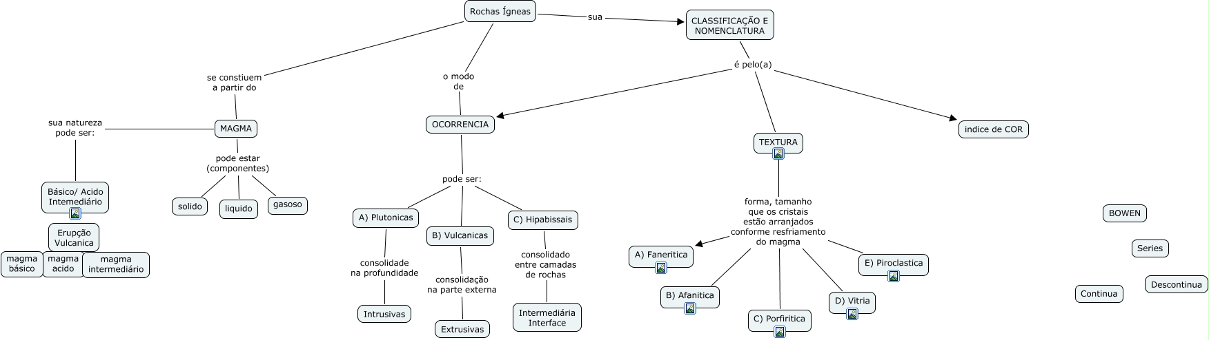 Esse mapa conceitual, produzido no IHMC CmapTools, tem a informação relacionada a: SISTEMA TERRA I [3] rochas igneas, CLASSIFICAÇÃO E NOMENCLATURA é pelo(a) TEXTURA, MAGMA sua natureza pode ser: Básico/ Acido Intemediário, TEXTURA forma, tamanho que os cristais estão arranjados conforme resfriamento do magma C) Porfiritica, B) Vulcanicas consolidação na parte externa Extrusivas, OCORRENCIA pode ser: C) Hipabissais, C) Hipabissais consolidado entre camadas de rochas Intermediária Interface, MAGMA pode estar (componentes) gasoso, TEXTURA forma, tamanho que os cristais estão arranjados conforme resfriamento do magma A) Faneritica, MAGMA pode estar (componentes) solido, Rochas Ígneas sua CLASSIFICAÇÃO E NOMENCLATURA, OCORRENCIA pode ser: B) Vulcanicas, CLASSIFICAÇÃO E NOMENCLATURA é pelo(a) indice de COR, TEXTURA forma, tamanho que os cristais estão arranjados conforme resfriamento do magma B) Afanitica, Rochas Ígneas o modo de OCORRENCIA, OCORRENCIA pode ser: A) Plutonicas, TEXTURA forma, tamanho que os cristais estão arranjados conforme resfriamento do magma E) Piroclastica, Rochas Ígneas se constiuem a partir do MAGMA, A) Plutonicas consolidade na profundidade Intrusivas, CLASSIFICAÇÃO E NOMENCLATURA é pelo(a) OCORRENCIA, TEXTURA forma, tamanho que os cristais estão arranjados conforme resfriamento do magma D) Vitria