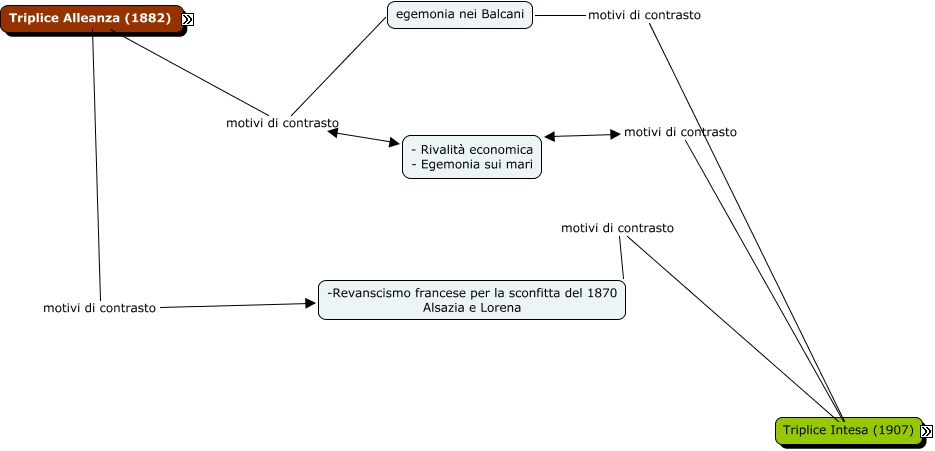 Questa Cmap, creata con IHMC CmapTools, contiene informazioni relative a: Prima Guerra Mondiale - le alleanze contrapposte, Inghilterra motivi di contrasto - Rivalità economica - Egemonia sui mari, Russia motivi di contrasto egemonia nei Balcani, Germania - Impero Prussiano motivi di contrasto -Revanscismo francese per la sconfitta del 1870 Alsazia e Lorena, Francia motivi di contrasto -Revanscismo francese per la sconfitta del 1870 Alsazia e Lorena, Austria - Impero Austroungarico motivi di contrasto - Rivalità economica - Egemonia sui mari, Austria - Impero Austroungarico motivi di contrasto egemonia nei Balcani
