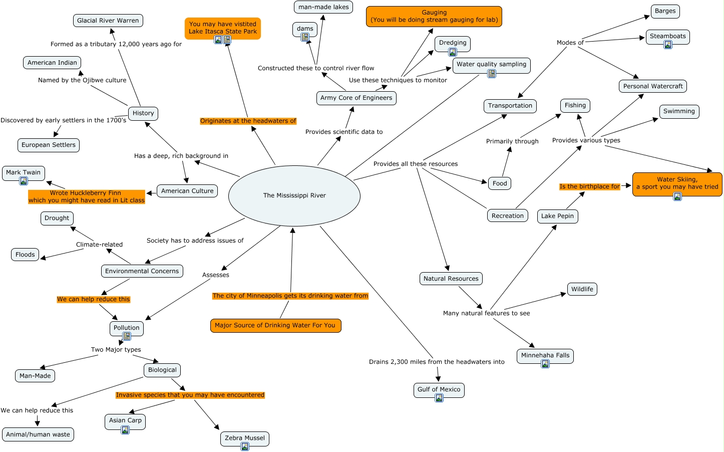 This Concept Map has information related to: Corts - Mississippi River draft, Natural Resources Many natural features to see Lake Pepin, The Mississippi River Society has to address issues of Environmental Concerns, History Named by the Ojibwe culture American Indian, Biological Invasive species that you may have encountered Asian Carp, Army Core of Engineers Constructed these to control river flow dams, Environmental Concerns Climate-related Floods, Recreation Provides various types Personal Watercraft, Natural Resources Many natural features to see Wildlife, Army Core of Engineers Use these techniques to monitor Dredging, Major Source of Drinking Water For You The city of Minneapolis gets its drinking water from The Mississippi River