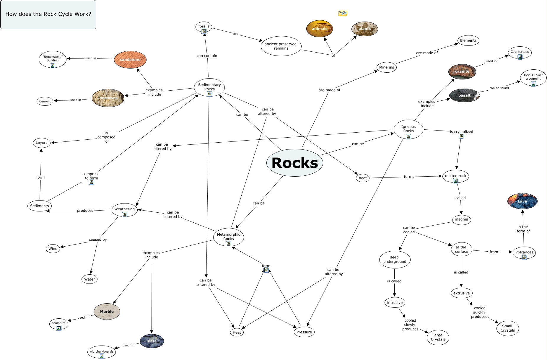 This Concept Map has information related to: Blascyk draft- rock cycle, Sedimentary Rocks are composed of Layers, basalt can be found Devils Tower Wyonming, Rocks can be Metamorphic Rocks, ancient preserved remains of animals, fossils are ancient preserved remains, at the surface from Volcanoes, Minerals are made of Elements, at the surface is called extrusive, Sedimentary Rocks can be altered by Pressure, slate used in old chalkboards