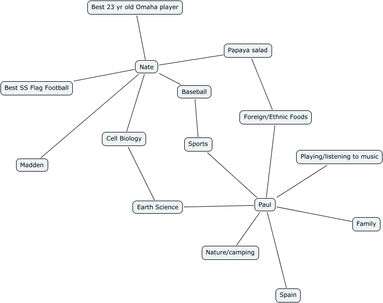This Concept Map has information related to: Nate and Paul, Best SS Flag Football Nate, Cell Biology Nate, Papaya salad Foreign/Ethnic Foods, Cell Biology Earth Science, Best 23 yr old Omaha player Nate, Sports Paul, Foreign/Ethnic Foods Paul, Baseball Sports, Nature/camping Paul, Madden Nate