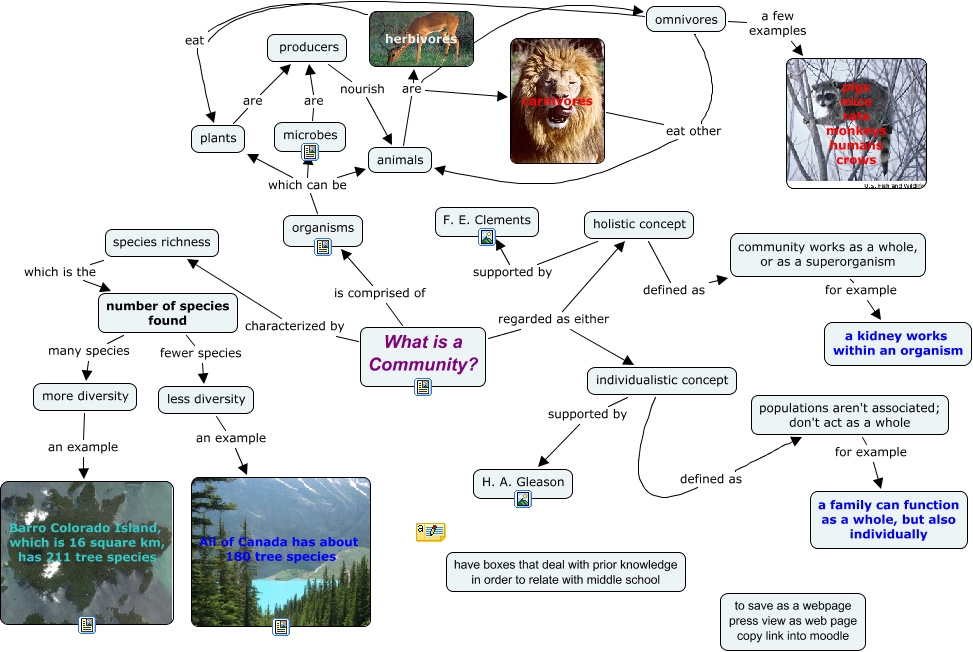 This Concept Map has information related to: Schwaderer Performance cmap, producers nourish animals, animals are carnivores, holistic concept supported by F. E. Clements, individualistic concept supported by H. A. Gleason, species richness which is the number of species found, individualistic concept defined as populations aren't associated; don't act as a whole, holistic concept defined as community works as a whole, or as a superorganism, microbes are producers, What is a Community? regarded as either individualistic concept, omnivores eat plants