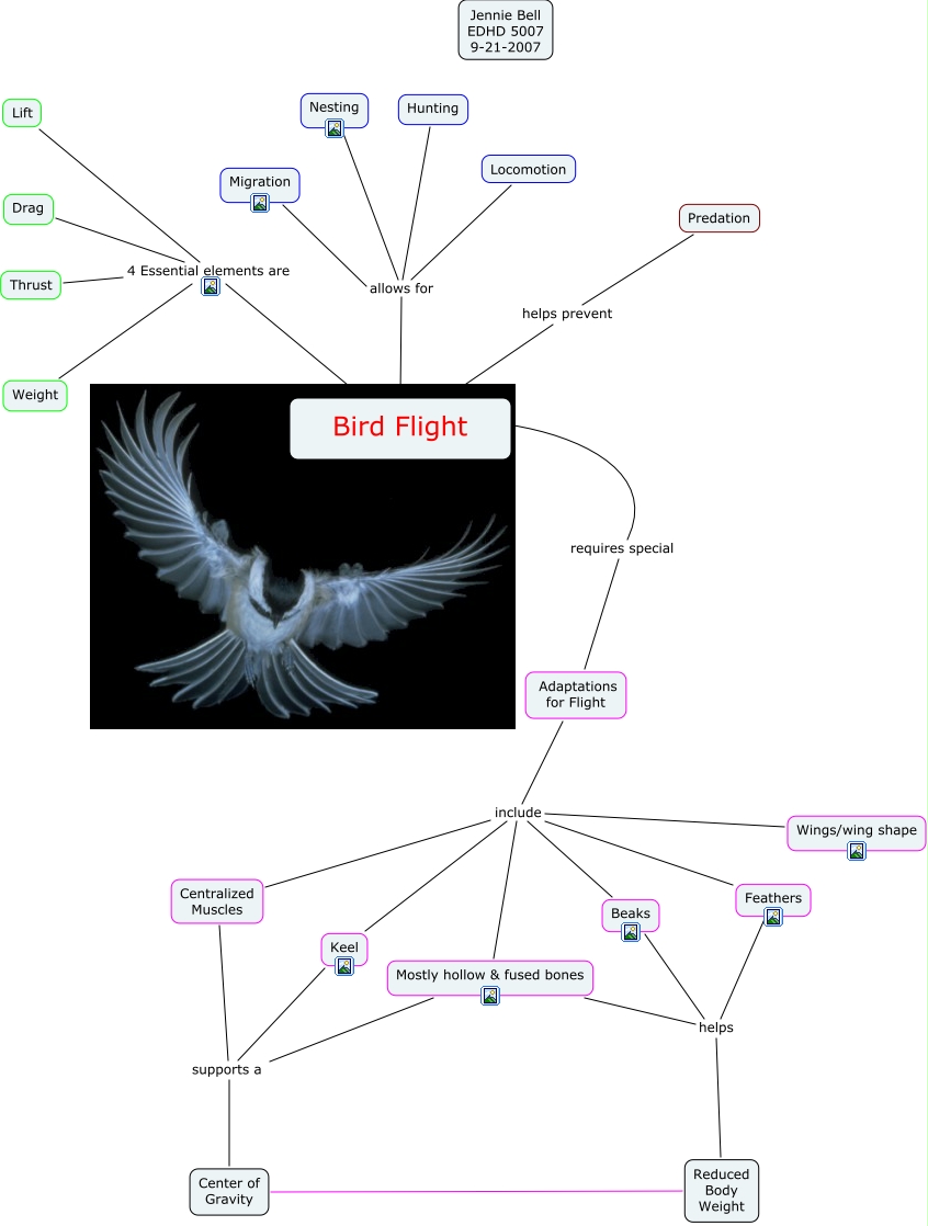This Concept Map has information related to: Draft-Bird Flight-Jennie Bell, Beaks include Keel, Adaptations for Flight include Keel, Migration allows for Locomotion, Wings/wing shape include Keel, Mostly hollow & fused bones include Keel, Bird Flight requires special Adaptations for Flight, Bird Flight allows for Locomotion, Bird Flight 4 Essential elements are Drag, Centralized Muscles supports a Keel, Center of Gravity Reduced Body Weight