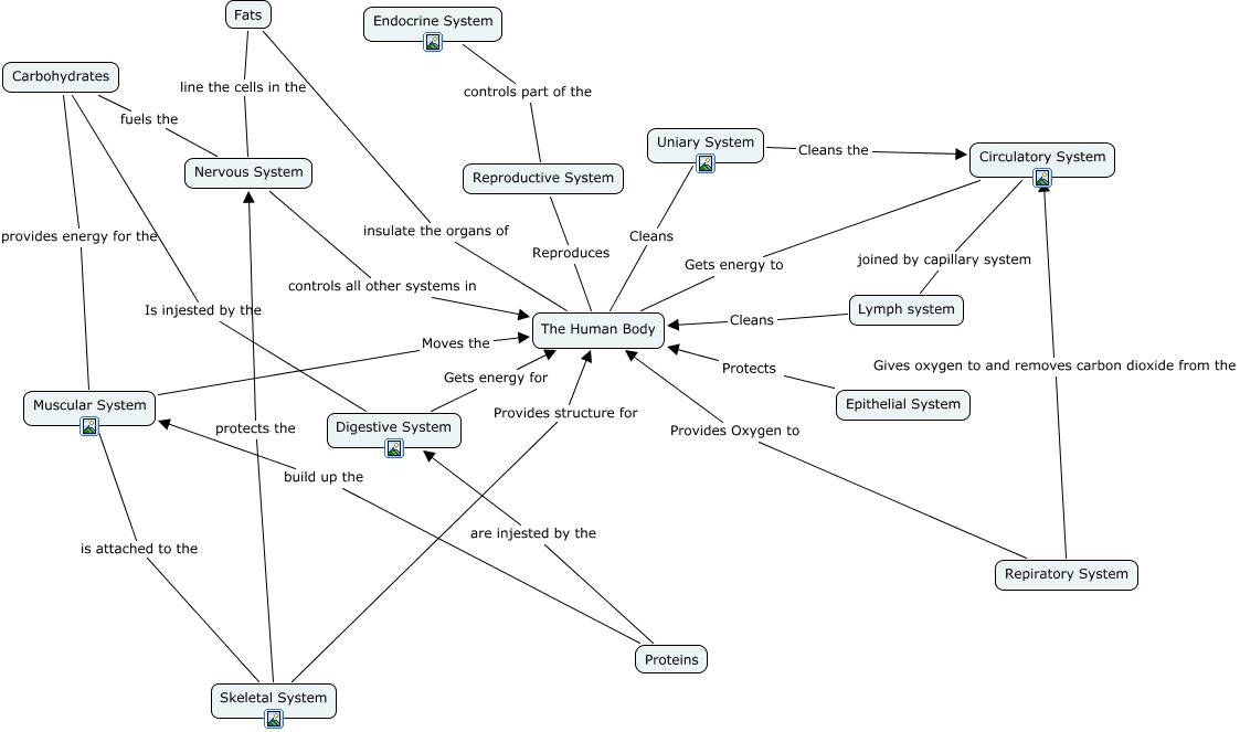 This Concept Map has information related to: Draft Systems, Digestive System Gets energy for The Human Body, Proteins are injested by the Digestive System, Uniary System Cleans The Human Body, Reproductive System Reproduces The Human Body, Repiratory System Provides Oxygen to The Human Body, Epithelial System Protects The Human Body, Uniary System Cleans the Circulatory System, Fats insulate the organs of The Human Body, Endocrine System controls part of the Reproductive System, Nervous System controls all other systems in The Human Body