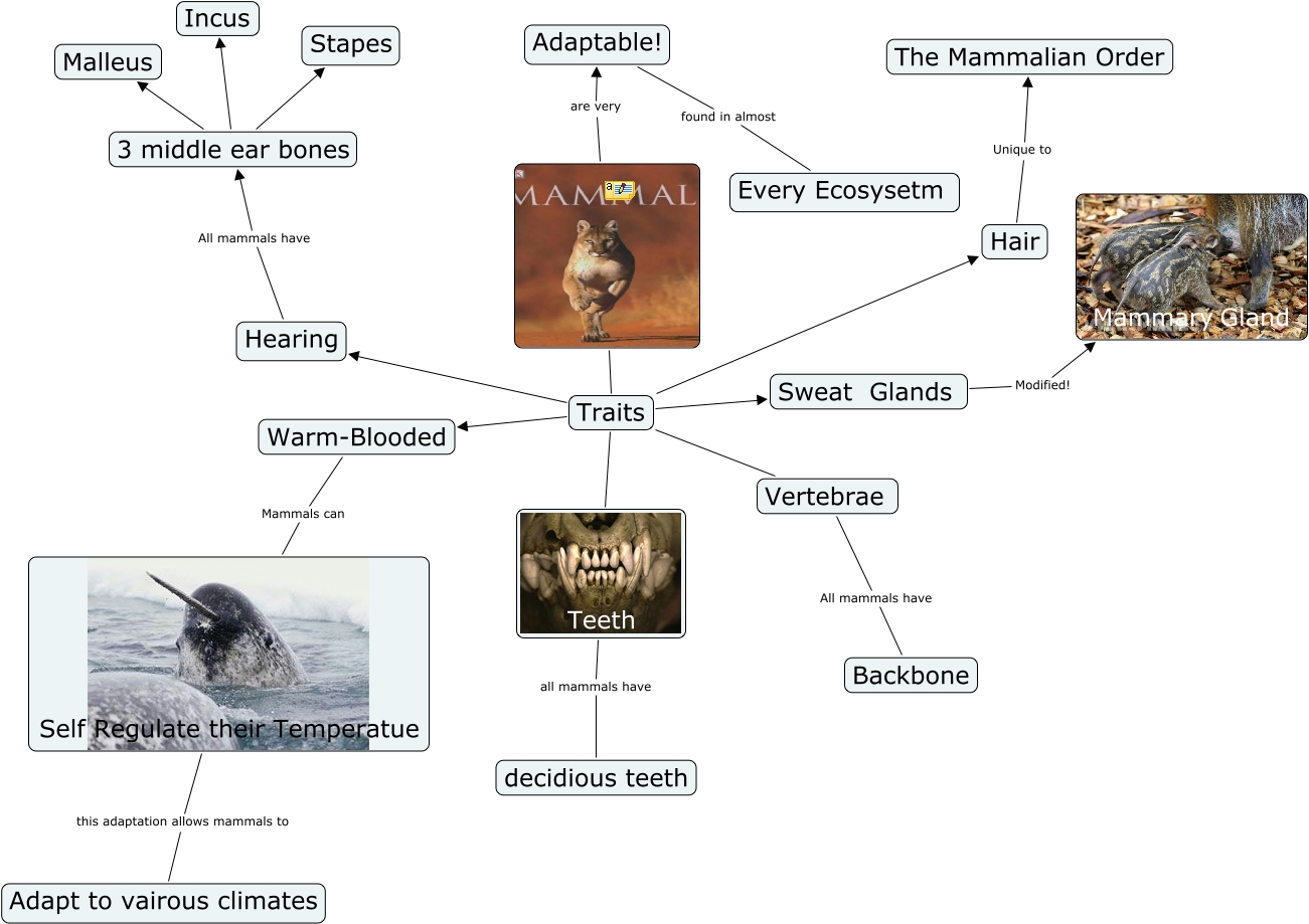 Matt Kuehl Cmap draft1, Warm-Blooded Mammals can Self Regulate their Temperatue, Hair Unique to The Mammalian Order, Traits Hair, 3 middle ear bones Malleus, Self Regulate their Temperatue this adaptation allows mammals to Adapt to vairous climates, Traits Teeth, Traits Vertebrae, Hearing All mammals have 3 middle ear bones, Teeth all mammals have decidious teeth, 3 middle ear bones Stapes