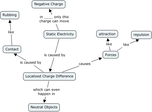 This Concept Map has information related to: Quosig Static, Forces like repulsion, Forces like attraction, Contact like Rubbing, Static Electricity in ____ only this charge can move Negative Charge, Localized Charge Difference causes Forces, Localized Charge Difference which can even happen in Neutral Objects, Static Electricity is caused by Localized Charge Difference, Localized Charge Difference is caused by Contact