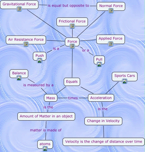 This Concept Map has information related to: CMAP1Gretchen, Acceleration is the Change in Velocity, Equals Mass, Force or a Pull, Air Resistance Force Force, Mass times Acceleration, Applied Force Force, Sports Cars Acceleration, Frictional Force Force, Force Equals, Normal Force Force