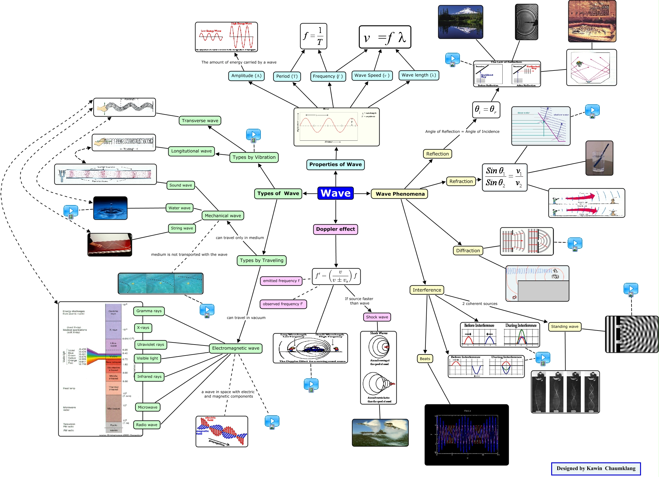 This Concept Map has information related to: Wave - Kawin, , Types by Vibration Transverse wave, String wave , Frequency (f) , , Wave Wave Phenomena, , Frequency (f) v = f, Diffraction , Mechanical wave medium is not transported with the wave