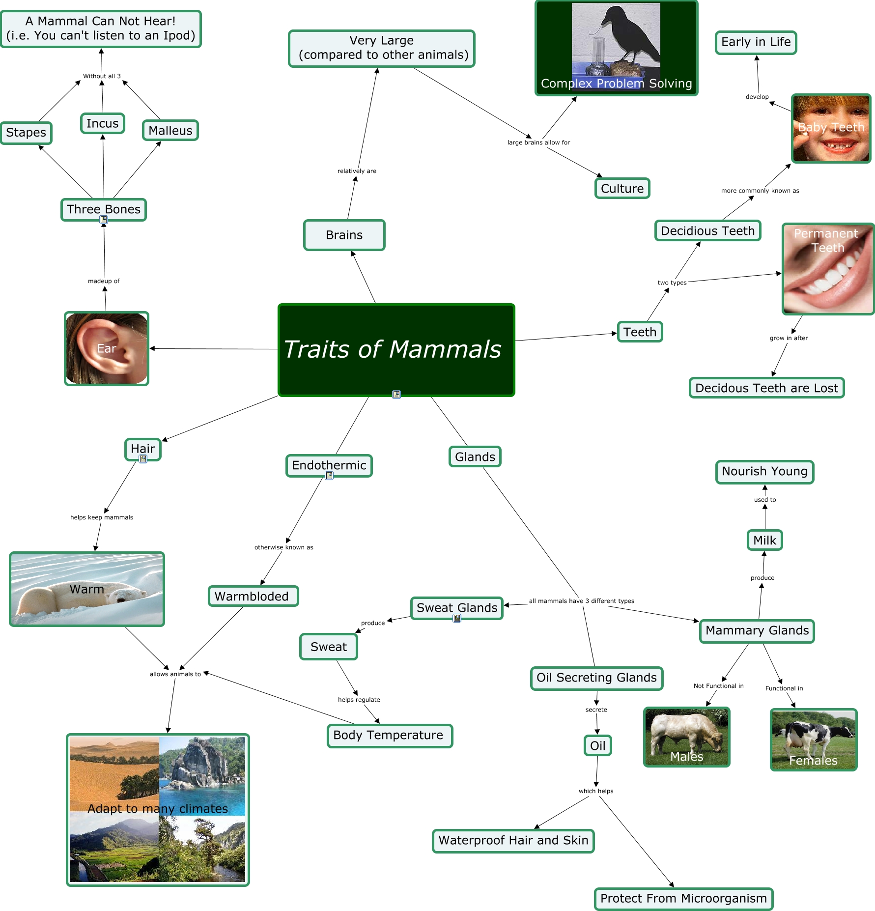 This Concept Map has information related to: matt kuehl another rough draft, Stapes Without all 3 A Mammal Can Not Hear! (i.e. You can't listen to an Ipod), Sweat helps regulate Body Temperature, Glands all mammals have 3 different types Sweat Glands, Mammary Glands produce Milk, Glands all mammals have 3 different types Mammary Glands, Mammary Glands Not Functional in Males, Traits of Mammals Glands, Ear madeup of Three Bones, Malleus Without all 3 A Mammal Can Not Hear! (i.e. You can't listen to an Ipod), Permanent Teeth grow in after Decidous Teeth are Lost