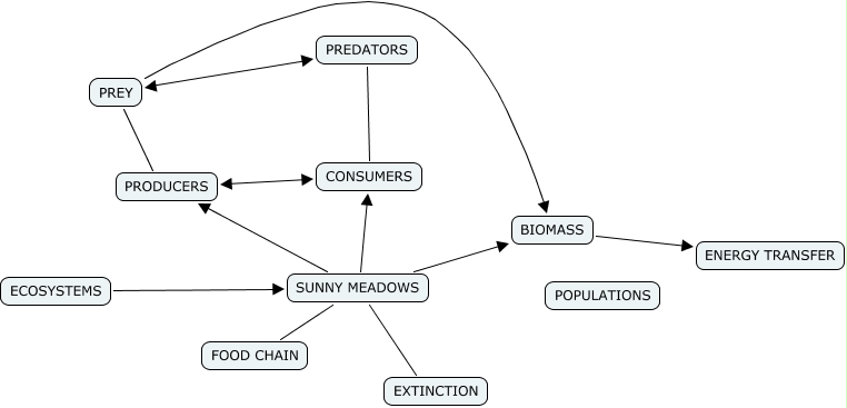 This Concept Map has information related to: SIMULATION SUNNY MEADOWS, PREY PRODUCERS, SUNNY MEADOWS BIOMASS, PREDATORS CONSUMERS, PRODUCERS CONSUMERS, SUNNY MEADOWS PRODUCERS, SUNNY MEADOWS CONSUMERS, PREY PREDATORS, SUNNY MEADOWS EXTINCTION, ECOSYSTEMS SUNNY MEADOWS, SUNNY MEADOWS FOOD CHAIN