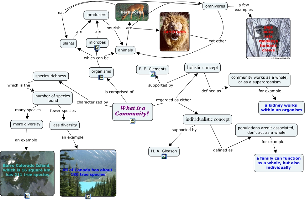 This Concept Map has information related to: Schwaderer Performance cmap, What is a Community? is comprised of organisms, species richness which is the number of species found, What is a Community? characterized by species richness, omnivores eat other animals, herbivores eat plants, holistic concept defined as community works as a whole, or as a superorganism, number of species found fewer species less diversity, animals are herbivores, carnivores eat other animals, holistic concept supported by F. E. Clements