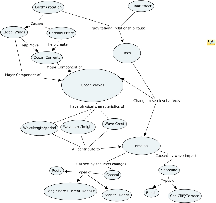 This Concept Map has information related to: Waves draft - Paul Corts, Earth's rotation gravitational relationship cause Tides, Coastal Types of Long Shore Current Deposit, Coreolis Effect Help create Ocean Currents, Shoreline Types of Beach, Ocean Waves Have physical characteristics of Wavelength/period, Tides Change in sea level affects Erosion, Erosion Caused by wave impacts Shoreline, Wave Crest All contribute to Erosion, Shoreline Types of Sea Cliff/Terrace, Wavelength/period All contribute to Erosion