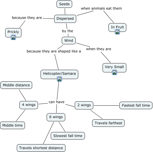 This Concept Map has information related to: Heli Cmap, Seeds Dispersed, Helicopter/Samara can have 4 wings, 4 wings Middle time, 6 wings Travels shortest distance, Wind when they are Very Small, 6 wings Slowest fall time, Wind because they are shaped like a Helicopter/Samara, Dispersed when animals eat them In Fruit, Helicopter/Samara can have 6 wings, Dispersed because they are Prickly