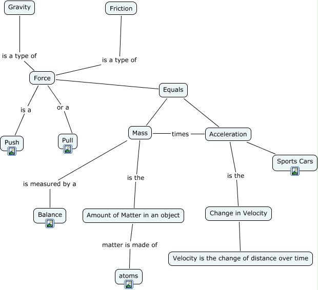 This Concept Map has information related to: CMAP1Gretchen(with links), Acceleration is the Change in Velocity, Equals Mass, Force or a Pull, Mass times Acceleration, Gravity is a type of Force, Sports Cars Acceleration, Friction is a type of Force, Force Equals, Mass is measured by a Balance, Change in Velocity Velocity is the change of distance over time