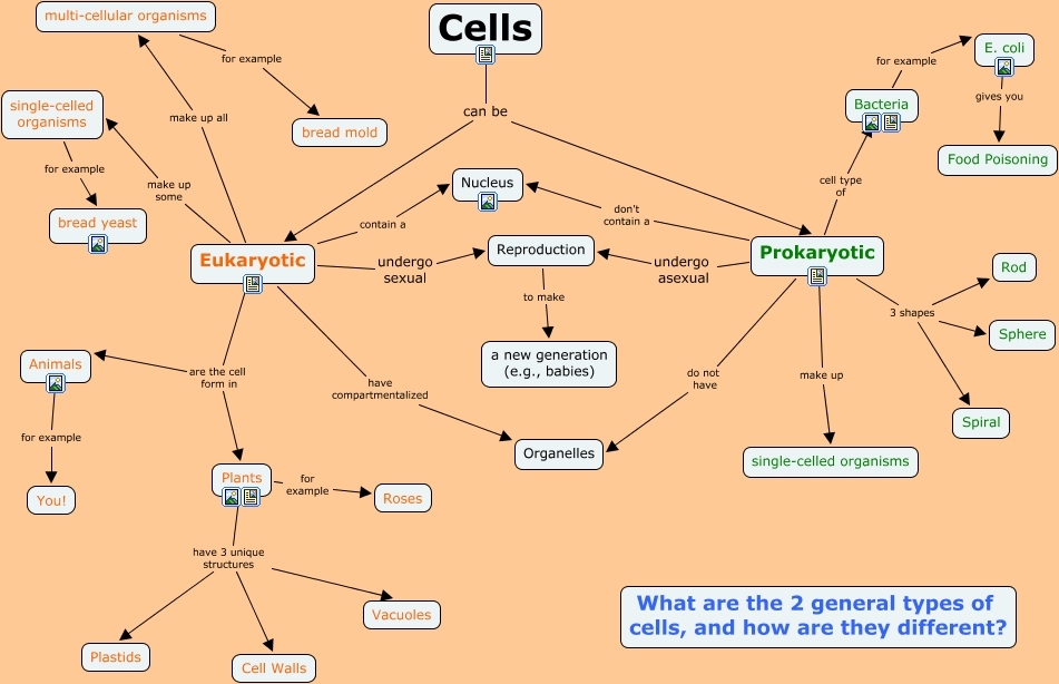 This Concept Map has information related to: Woker Final Draft, multi-cellular organisms for example bread mold, Prokaryotic 3 shapes Spiral, Plants have 3 unique structures Plastids, Eukaryotic have compartmentalized Organelles, Reproduction to make a new generation (e.g., babies), Eukaryotic undergo sexual Reproduction, Eukaryotic are the cell form in Animals, Eukaryotic contain a Nucleus, Cells can be Eukaryotic, Eukaryotic make up some single-celled organisms