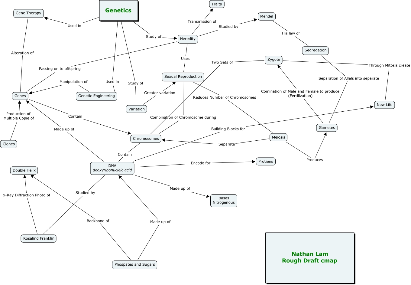 This Concept Map has information related to: LamGeneticsCMAP, Heredity Studied by Mendel, Gene Therapy Alteration of Genes, Genetics Used in Gene Therapy, Genetics Used in Genetic Engineering, Heredity Passing on to offspring Genes, DNA deoxyribonucleic acid Encode for Protiens, Segregation Separation of Allels into separate Gametes, Meiosis Separate Chromosomes, Zygote Through Mitosis create New Life, Phospates and Sugars Backbone of Double Helix