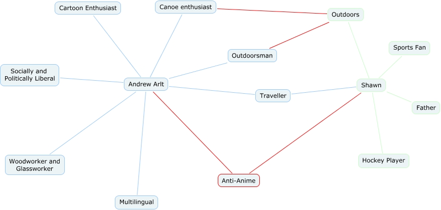 This Concept Map has information related to: Andrew_and_Shawn, Traveller Shawn, Canoe enthusiast Outdoors, Sports Fan Shawn, Traveller Andrew Arlt, Cartoon Enthusiast Andrew Arlt, Multilingual Andrew Arlt, Hockey Player Shawn, Woodworker and Glassworker Andrew Arlt, Anti-Anime Shawn, Father Shawn