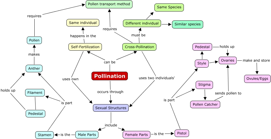 This Concept Map has information related to: Pollination_Arlt, Pedestal holds up Anther, Pollination can be Self-Fertilization, Sexual Structures include Female Parts, Cross-Pollination must be Different individual, Stamen is part Filament, Pollination occurs through Sexual Structures, Pedestal holds up Ovaries, Male Parts is the Stamen, Stigma Pollen Catcher, Self-Fertilization uses own Sexual Structures