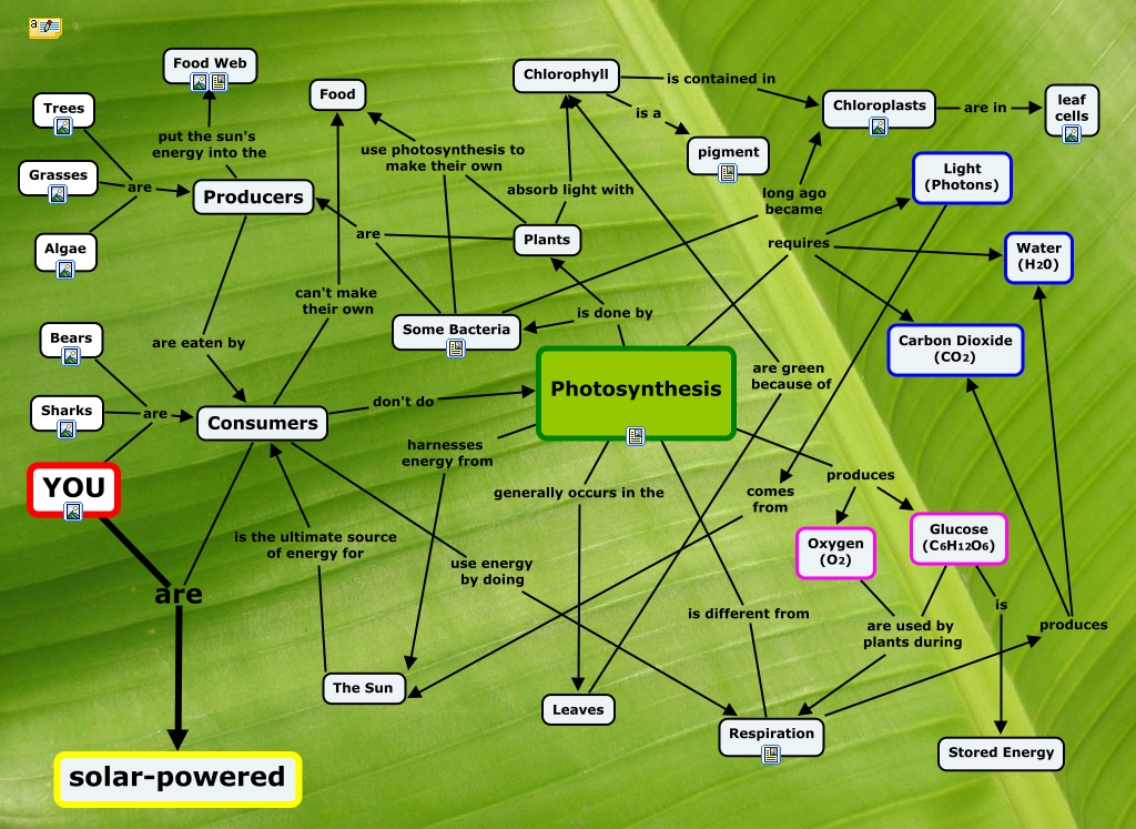 This Concept Map has information related to: Photosynthesis - Drake, Consumers are solar-powered, Trees are Producers, Producers are eaten by Consumers, Photosynthesis is different from Respiration, Photosynthesis generally occurs in the Leaves, Some Bacteria long ago became Chloroplasts, Photosynthesis produces Glucose (C6H12O6), Respiration produces Carbon Dioxide (CO2), Consumers use energy by doing Respiration, Grasses are Producers