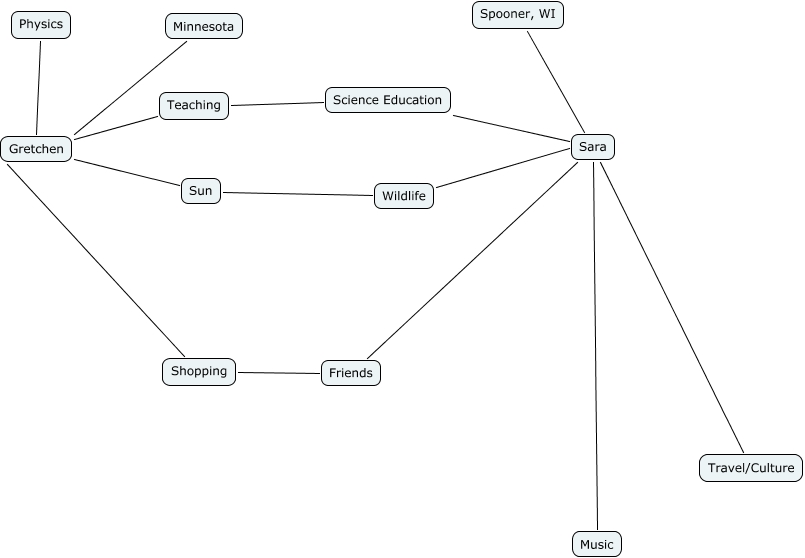 This Concept Map has information related to: Gretchen and Sara, Science Education Sara, Teaching Gretchen, Sun Gretchen, Music Sara, Friends Shopping, Travel/Culture Sara, Shopping Gretchen, Science Education Teaching, Sara Friends, Wildlife Sun