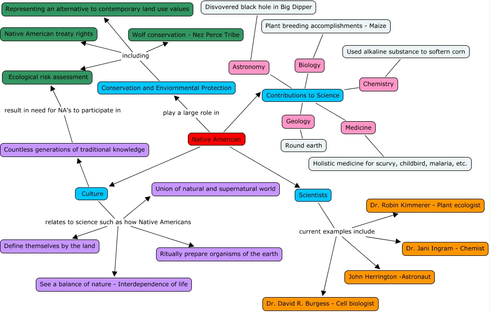 This Concept Map, created with IHMC CmapTools, has information related to: Native Americans in Science, Conservation and Enviornmental Protection including Ecological risk assessment, Contributions to Science Biology, Native American play a large role in Conservation and Enviornmental Protection, Countless generations of traditional knowledge result in need for NA's to participate in Ecological risk assessment, Native American Contributions to Science, Chemistry Used alkaline substance to softern corn, Holistic medicine for scurvy, childbird, malaria, etc. Medicine, Scientists current examples include Dr. David R. Burgess - Cell biologist, Culture relates to science such as how Native Americans Ritually prepare organisms of the earth, Astronomy Disvovered black hole in Big Dipper, Scientists current examples include Dr. Robin Kimmerer - Plant ecologist, Native American Culture, Conservation and Enviornmental Protection including Wolf conservation - Nez Perce Tribe, Biology Plant breeding accomplishments - Maize, Geology Round earth, Scientists current examples include John Herrington -Astronaut, Geology Contributions to Science, Culture relates to science such as how Native Americans Define themselves by the land, Contributions to Science Medicine, Contributions to Science Chemistry