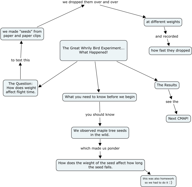 Schwaderer.H'sL.Simulation, The Great Whrily Bird Experiment... What Happened! The Results, at different weights and recorded how fast they dropped, The Great Whrily Bird Experiment... What Happened! The Question: How does weight affect flight time., We observed maple tree seeds in the wild. which made us ponder How does the wieght of the seed affect how long the seed falls., The Results see the Next CMAP!, The Question: How does weight affect flight time. to test this we made "seeds" from paper and paper clips, What you need to know before we begin you should know We observed maple tree seeds in the wild., we made "seeds" from paper and paper clips we dropped them over and over at different weights, How does the wieght of the seed affect how long the seed falls. ???? this was also homework so we had to do it :), The Great Whrily Bird Experiment... What Happened! What you need to know before we begin