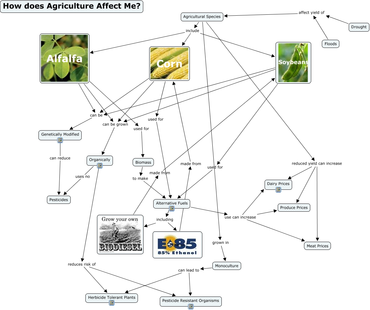 This Concept Map has information related to: Morphew Draft2, Alternative Fuels use can increase Dairy Prices, Monoculture can lead to Herbicide Tolerant Plants, Corn used for Alternative Fuels, Agricultural Species reduced yield can increase Dairy Prices, Organically reduces risk of Pesticide Resistant Organisms, Agricultural Species grown in Monoculture, Biodiesel made from Soybeans, Soybeans used for Alternative Fuels, Soybeans can be Genetically Modified, Alternative Fuels use can increase Produce Prices