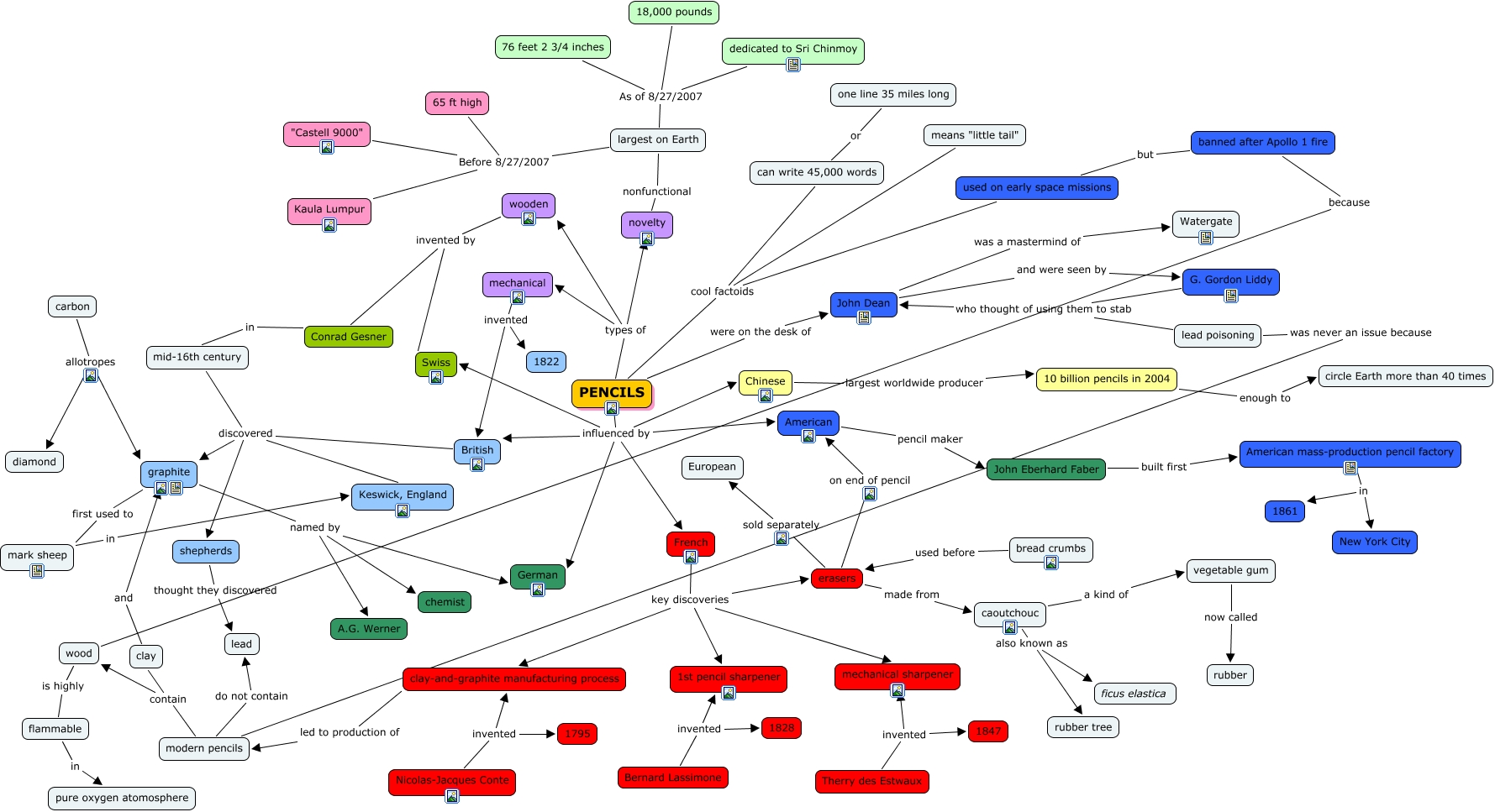 This Concept Map has information related to: Pencil mania - Anna, banned after Apollo 1 fire because wood, British discovered Keswick, England, PENCILS cool factoids can write 45,000 words, John Dean and were seen by G. Gordon Liddy, largest on Earth Before 8/27/2007 65 ft high, graphite first used to mark sheep, French key discoveries 1st pencil sharpener, graphite named by A.G. Werner, graphite named by German, used on early space missions but banned after Apollo 1 fire