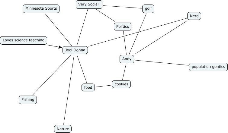 This Concept Map has information related to: joel and andy, Fishing Joel Donna, Politics Andy, food cookies, Minnesota Sports Joel Donna, cookies Andy, golf Andy, Nature Joel Donna, Very Social golf, population gentics Andy, Very Social Politics