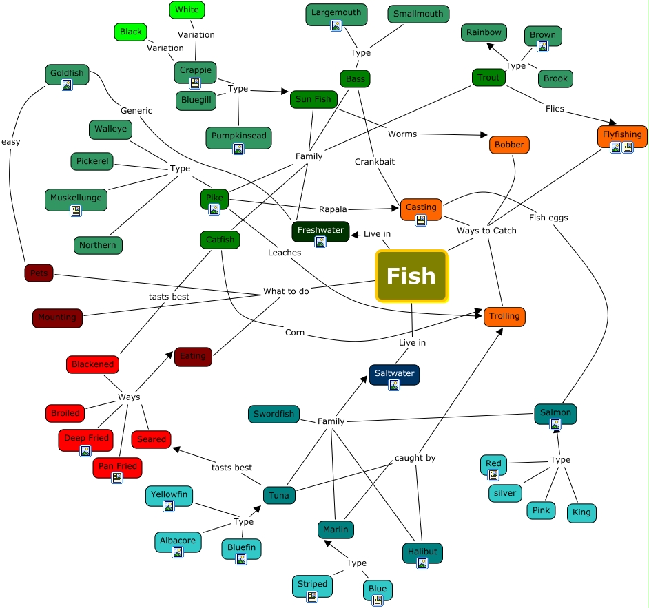 This Concept Map has information related to: josh's fish, Pickerel Type Pike, silver Type Salmon, Trout Flies Flyfishing, Goldfish Generic Freshwater, Catfish tasts best Blackened, Tuna tasts best Seared, Trolling Ways to Catch Fish, Brook Type Rainbow, Blue Type Marlin, Fish Live in Freshwater