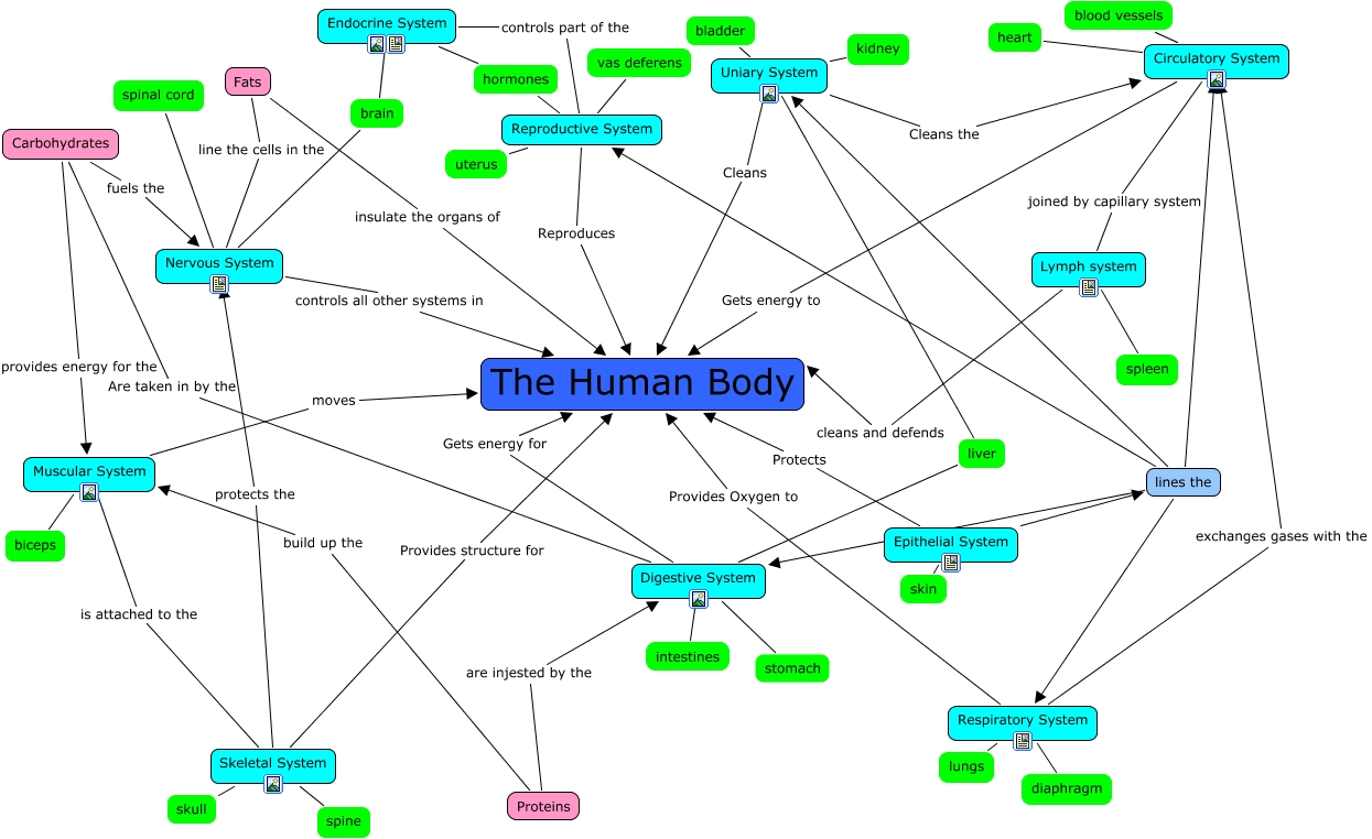 This Concept Map has information related to: 2, Epithelial System lines the, Carbohydrates fuels the Nervous System, Carbohydrates Are taken in by the Digestive System, Uniary System Cleans the Circulatory System, blood vessels Circulatory System, Muscular System moves The Human Body, intestines Digestive System, Endocrine System brain, Digestive System Gets energy for The Human Body, lines the Digestive System