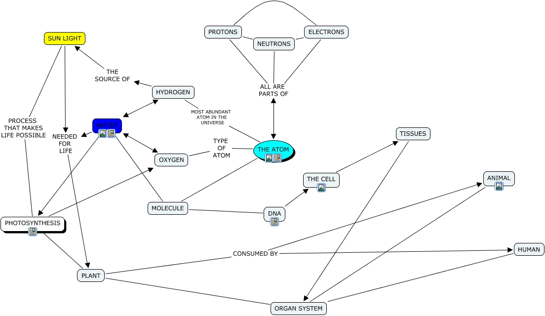 This Concept Map has information related to: the atom shawn kuykendall, WATER PHOTOSYNTHESIS, ANIMAL ORGAN SYSTEM, THE CELL TISSUES, SUN LIGHT NEEDED FOR LIFE PLANT, PLANT ORGAN SYSTEM, ELECTRONS NEUTRONS, HUMAN ORGAN SYSTEM, SUN LIGHT PROCESS THAT MAKES LIFE POSSIBLE PHOTOSYNTHESIS, OXYGEN TYPE OF ATOM THE ATOM, PROTONS ALL ARE PARTS OF THE ATOM