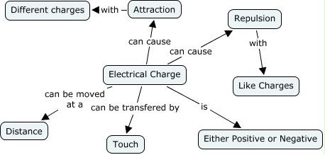 This Concept Map has information related to: quosig Electrical Charge, Electrical Charge can cause Attraction, Electrical Charge is Either Positive or Negative, Attraction with Different charges, Repulsion with Like Charges, Electrical Charge can be moved at a Distance, Electrical Charge can be transfered by Touch, Electrical Charge can cause Repulsion