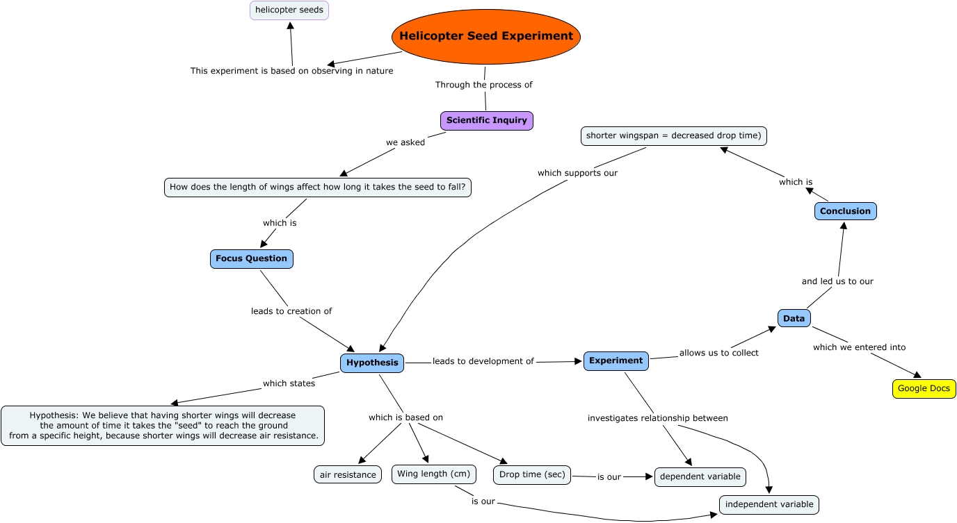 This Concept Map has information related to: Googles Docs Perf Task PAC, Hypothesis leads to development of Experiment, Hypothesis which is based on Drop time (sec), How does the length of wings affect how long it takes the seed to fall? which is Focus Question, Helicopter Seed Experiment This experiment is based on observing in nature helicopter seeds, Conclusion which is shorter wingspan = decreased drop time), Hypothesis which is based on Wing length (cm), Hypothesis which states Hypothesis: We believe that having shorter wings will decrease the amount of time it takes the "seed" to reach the ground from a specific height, because shorter wings will decrease air resistance., Hypothesis which is based on air resistance, Wing length (cm) is our independent variable, Data which we entered into Google Docs