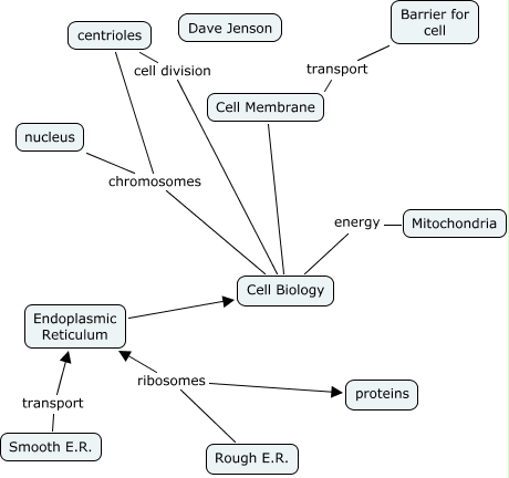 This Concept Map has information related to: Dave Jenson Cmap for Sim in Science, Endoplasmic Reticulum Cell Biology, Rough E.R. ribosomes Endoplasmic Reticulum, Barrier for cell transport Cell Membrane, centrioles cell division Cell Biology, Smooth E.R. transport Endoplasmic Reticulum, Mitochondria energy Cell Biology, centrioles chromosomes Cell Biology, nucleus chromosomes Cell Biology, Cell Membrane Cell Biology, Rough E.R. ribosomes proteins