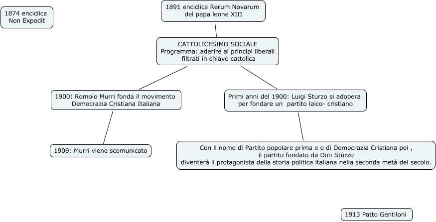 Questa Cmap, creata con IHMC CmapTools, contiene informazioni relative a: Il cattoliicesimo sociale, Primi anni del 1900: Luigi Sturzo si adopera per fondare un partito laico- cristiano Con il nome di Partito popolare prima e e di Democrazia Cristiana poi , il partito fondato da Don Sturzo diventerà il protagonista della storia politica italiana nella seconda metà del secolo., CATTOLICESIMO SOCIALE Programma: aderire ai principi liberali filtrati in chiave cattolica Primi anni del 1900: Luigi Sturzo si adopera per fondare un partito laico- cristiano, 1900: Romolo Murri fonda il movimento Democrazia Cristiana Italiana 1909: Murri viene scomunicato, 1891 enciclica Rerum Novarum del papa leone XIII CATTOLICESIMO SOCIALE Programma: aderire ai principi liberali filtrati in chiave cattolica, CATTOLICESIMO SOCIALE Programma: aderire ai principi liberali filtrati in chiave cattolica 1900: Romolo Murri fonda il movimento Democrazia Cristiana Italiana