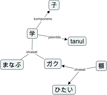 This Concept Map, created with IHMC CmapTools, has information related to: teszt1, 学 olvasat まなぶ, 学 olvasat ガク, 額 olvasat ガク, 学 jelentés tanul, 学 komponens 子, 額 olvasat ひたい