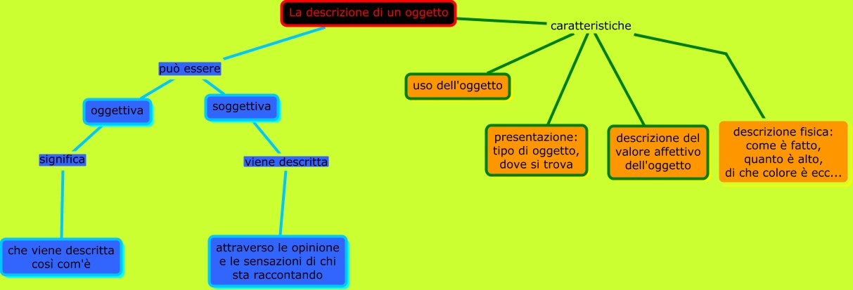 Questa Cmap, creata con IHMC CmapTools, contiene informazioni relative a: descrizione di un'oggetto, La descrizione di un oggetto caratteristiche presentazione: tipo di oggetto, dove si trova, La descrizione di un oggetto caratteristiche uso dell'oggetto, La descrizione di un oggetto può essere oggettiva, La descrizione di un oggetto caratteristiche descrizione del valore affettivo dell'oggetto, soggettiva viene descritta attraverso le opinione e le sensazioni di chi sta raccontando, La descrizione di un oggetto caratteristiche descrizione fisica: come è fatto, quanto è alto, di che colore è ecc..., La descrizione di un oggetto può essere soggettiva, oggettiva significa che viene descritta così com'è