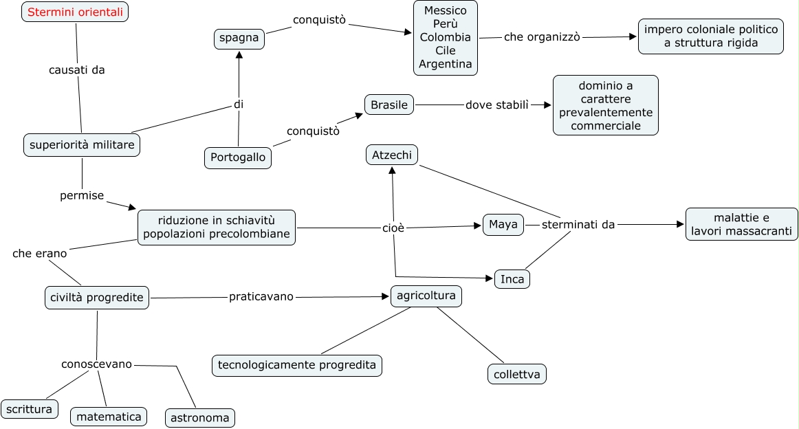 Questa Cmap, creata con IHMC CmapTools, contiene informazioni relative a: stermini orientali, riduzione in schiavitù popolazioni precolombiane cioè Maya, civiltà progredite praticavano agricoltura, riduzione in schiavitù popolazioni precolombiane cioè Inca, superiorità militare di spagna, civiltà progredite conoscevano scrittura, riduzione in schiavitù popolazioni precolombiane che erano civiltà progredite, Messico Perù Colombia Cile Argentina che organizzò impero coloniale politico a struttura rigida, superiorità militare permise riduzione in schiavitù popolazioni precolombiane, Maya sterminati da malattie e lavori massacranti, Inca sterminati da malattie e lavori massacranti, civiltà progredite conoscevano astronoma, Atzechi sterminati da malattie e lavori massacranti, agricoltura ???? collettva, civiltà progredite conoscevano matematica, superiorità militare di Portogallo, spagna conquistò Messico Perù Colombia Cile Argentina, Brasile dove stabilì dominio a carattere prevalentemente commerciale, riduzione in schiavitù popolazioni precolombiane cioè Atzechi, Stermini orientali causati da superiorità militare, Portogallo conquistò Brasile